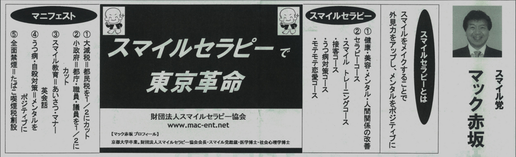 上に選挙公報を示しましたが、マニフェストが5つ掲載されているものの、全体的に自分の経営するスマイルセラピー協会の宣伝と捉えかねられないような内容になっています。ただ、様々なパフォーマンスや政見放送と比べると、マック赤坂は選挙公報はパンチが少ないというのが個人的な印象ではあります。なお、得票数ですが、4,985票で11人中9位という結果に終わっています*1。