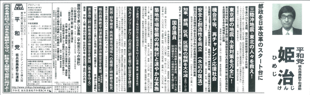 今回紹介するのは2011年4月10日に投票が行われた東京都知事選に立候補した姫治けんじです。この姫治けんじは無所属ではなく「平和党核兵器廃絶平和運動」という自分が作った政治団体所属で立候補しています。